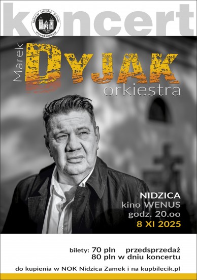Zapraszamy na koncert promujący najnowszą płytę Marka Dyjaka „Mężczyźni”. 8 XI 2025 / g. 20:00 / KINO WENUS w Nidzicy